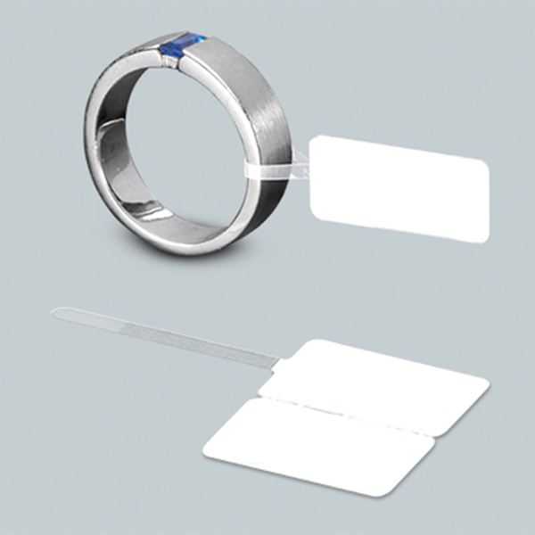 Bílé lesklé štítky s transparentním očkem vyrobené z polyethylenu. Štítky jsou velmi odolné proti otěru i oděru. Zároveň je potisk odolný i při ultrazvukovém a parním čištění.