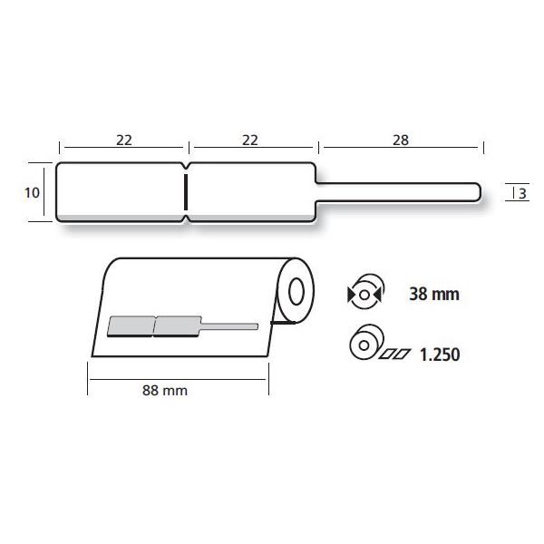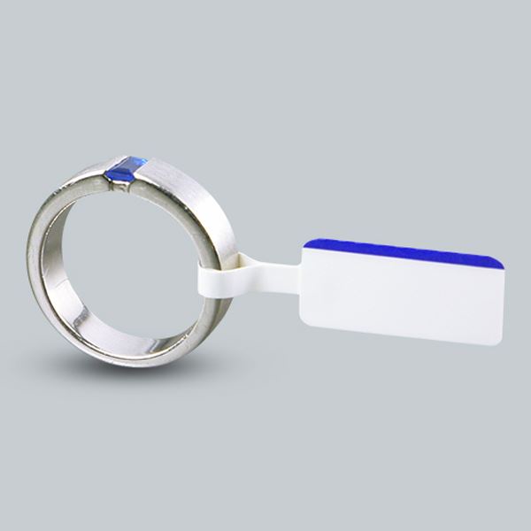 Lesklé bílé štítky s modrým proužkem a očkem vyrobené z polyethylenu. Štítky jsou velmi odolné proti otěru i oděru. Zároveň je potisk odolný i při ultrazvukovém a parním čištění.
