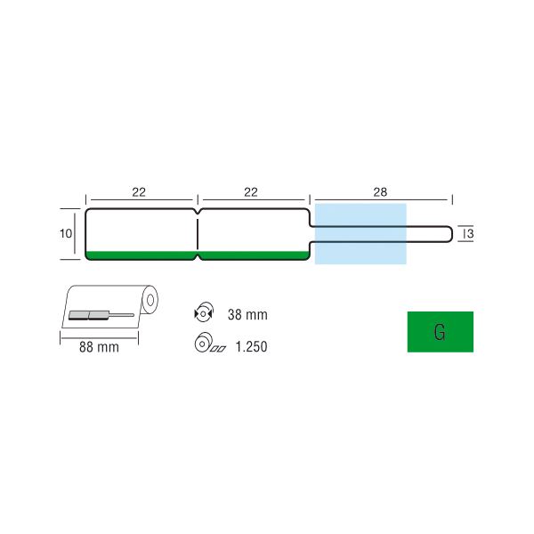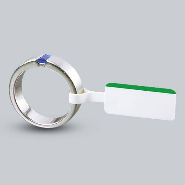 Lesklé bílé štítky se zeleným proužkem a očkem vyrobené z polyethylenu. Štítky jsou velmi odolné proti otěru i oděru. Zároveň je potisk odolný i při ultrazvukovém a parním čištění.