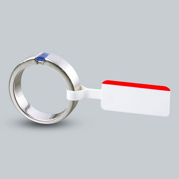 Lesklé bílé štítky s červeným proužkem a očkem vyrobené z polyethylenu. Štítky jsou velmi odolné proti otěru i oděru. Zároveň je potisk odolný i při ultrazvukovém a parním čištění.