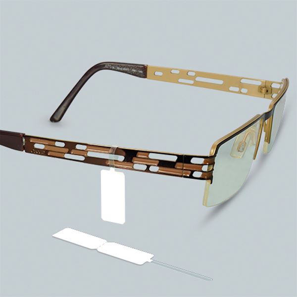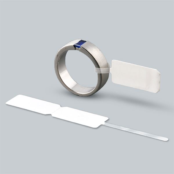 Bílé lesklé štítky s úzkým transparentním očkem vyrobené z polyesteru (očko je vyrobeno z polypropylenové fólie). Štítky jsou velmi odolné proti otěru i oděru. Zároveň je potisk odolný i při ultrazvukovém a parním čištění.