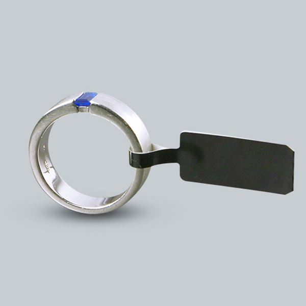 Černé štítky s očkem vyrobené z polyethylenu. Štítky jsou velmi odolné proti otěru i oděru. Zároveň je potisk odolný i při ultrazvukovém a parním čištění.