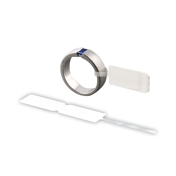 Stříbrné matné štítky s metalickým efektem a transparentním očkem vyrobené z polyesteru. Štítky jsou velmi odolné proti otěru i oděru. Zároveň je potisk odolný i při ultrazvukovém a parním čištění.