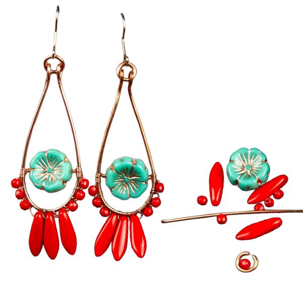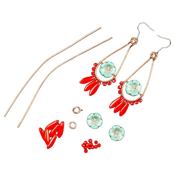 Balíček obsahuje: - 2 ks korálek květ - 6 ks korálek červený jazýček- 12 ks červené ohňovky - 2 ks měděný drát tlustý na slzu- 2 ks měděný drát na oplet korálků - 2 ks náušnicové háčky z chirurgické oceli + silikonové zarážky