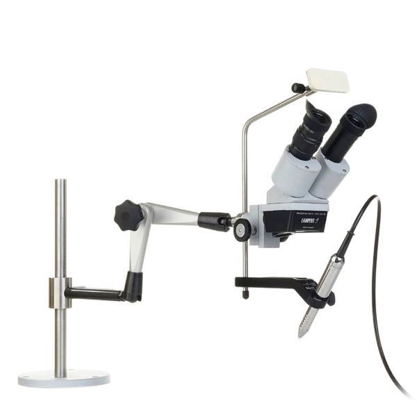 Mikroskop s kloubovým ramenem, který lze snadno otáčet a naklánět do všech směrů, díky čemuž je práce s ním obzvláště pohodlná a bez omezení. Poskytuje ještě větší flexibilitu při práci, např. při svařování větších předmětů. K připevnění na pracovní desku slouží robustní ocelová základna se třemi otvory pro zafixování.